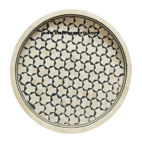 Elevate your home décor with this handcrafted round bone inlay tray, featuring an intricate black and ivory geometric star mosaic that blends timeless artistry with modern elegance. Perfect as a decorative serving tray, coffee table centerpiece, or a functional catchall for your vanity or entryway, this piece is designed to impress